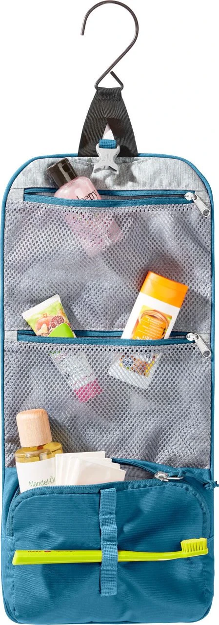 handy toiletry bag for hygiene items basic equipment stowable hook for hanging one large zip pocket two flat zip mesh pockets closure buckle loops for fixing toothbrushes and smaller hygiene items