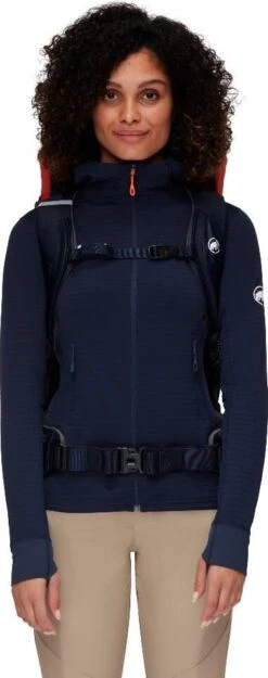 If you go hiking, then right. Your backpack must be able to pack quite a bit. The Lithium 40 Women is made mostly from recycled materials, the durable water repellent impregnation is PFC-free. The carrying system and the shoulder straps are specially tailored to the female anatomy. The back length can be adjusted to suit your needs. Anatomically shaped, softly padded hip and shoulder straps provide additional comfort. If you don’t need the hip belt, simply take it off. You do the same with the integrated rain cover and the bottom compartment which is accessible from the outside. Trekking poles and ice axes can be securely attached. The compression straps you can also use as a material holder. The Lithium 40 Women is compatible with hydration systems, you can access the side mesh pockets even while walking. A flexible and spacious companion for demanding tours.