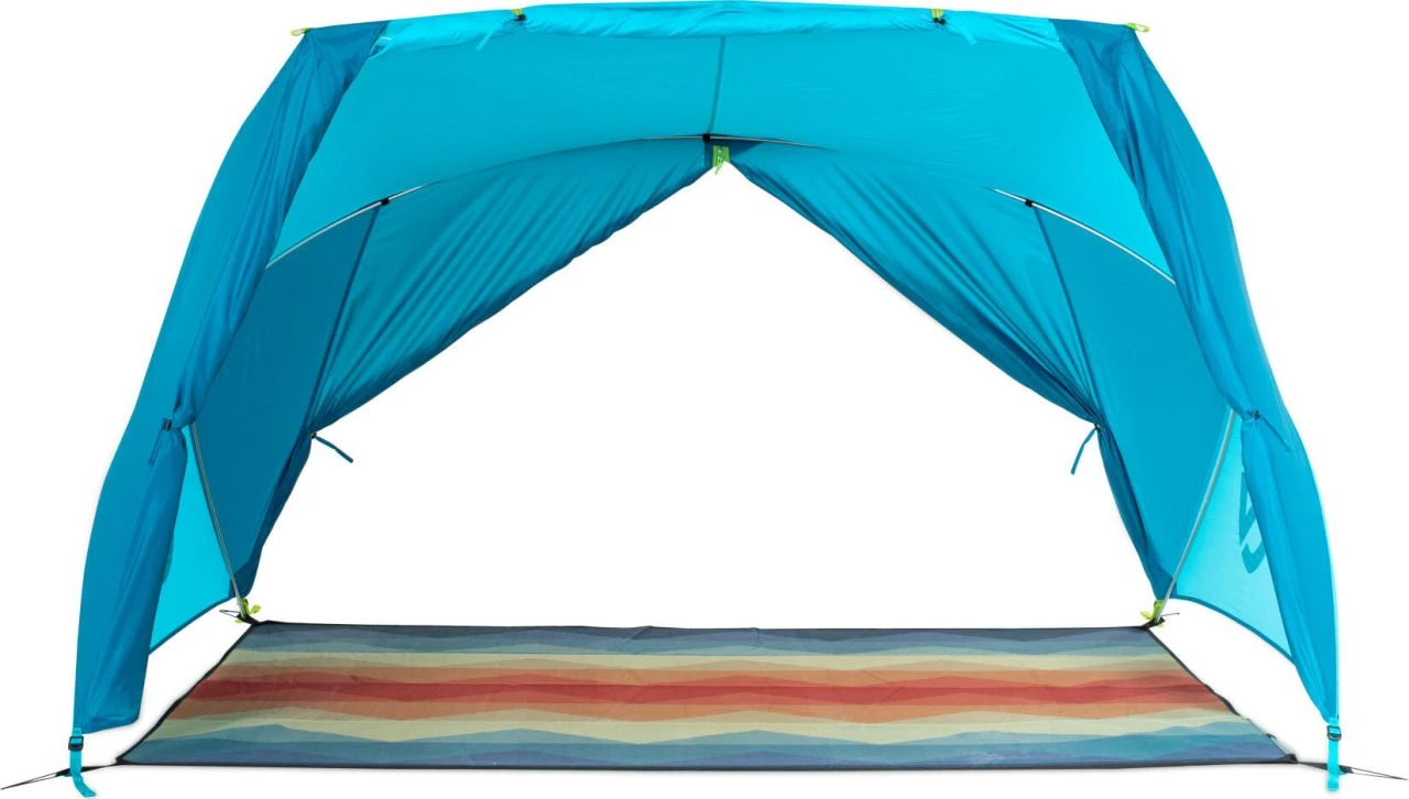 - Unique freestanding tent design with three pitching options including tent, umbrella house and parasol. (Straps for parasol included, tarp poles not included)