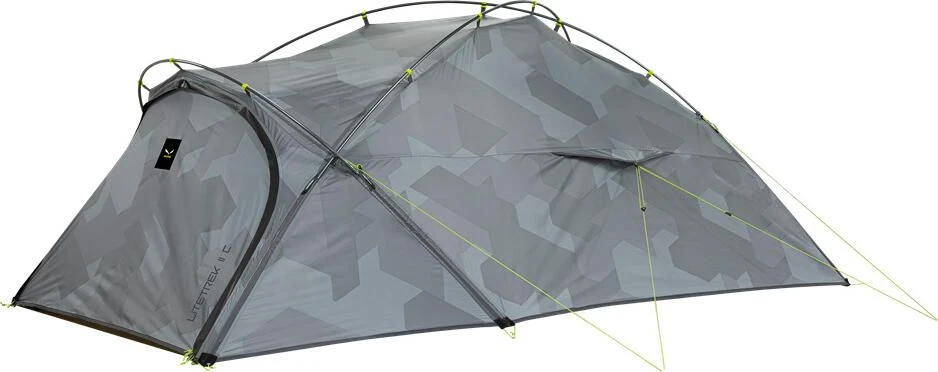 The Litetrek II is a double-walled 2-person tent. It is ideal for trekking in alpine terrain when protection from extreme weather, wind stability, light weight and compact pack size are particularly important. As a 3-season tent, it is ideal for use during the milder months of the year.The rugged and reliable semi-geodesic double wall construction separates you from wind and weather with two layers of fabric. It also provides optimal space utilization and excellent weather protection with good ventilation. The completely self-supporting design makes it easy to set up even in rocky terrain or alpine terrain that doesn’t offer enough room for setup with guy lines and pegs. The anchor points can also be extended for more flexibility, for example in snowy terrain. The highly tear-resistant, camouflage-colored flysheet of PU-coated 50D ripstop polyester has a water column of 3,000 mm, and the tent floor is made of durable PU-coated 70D ripstop nylon with a water column of 5,000 mm. The inner tent made of 66D ripstop polyester has a mesh entrance with integrated mosquito net. The rear ventilation opening can be opened with zippers from both inside and outside – so you can always provide fresh air and avoid moisture inside.Thanks to Salewa’s 3S Speed Set Up concept with short, flat pole sleeves and hooks, the tent is quick and easy to set up. In good weather and on warm nights, you can also simply pitch just the outer tent. The inner tent has an integrated weatherproof vestibule for cooking and storing luggage. Our lightweight, durable 2-person tent in camouflage for alpine trekking.