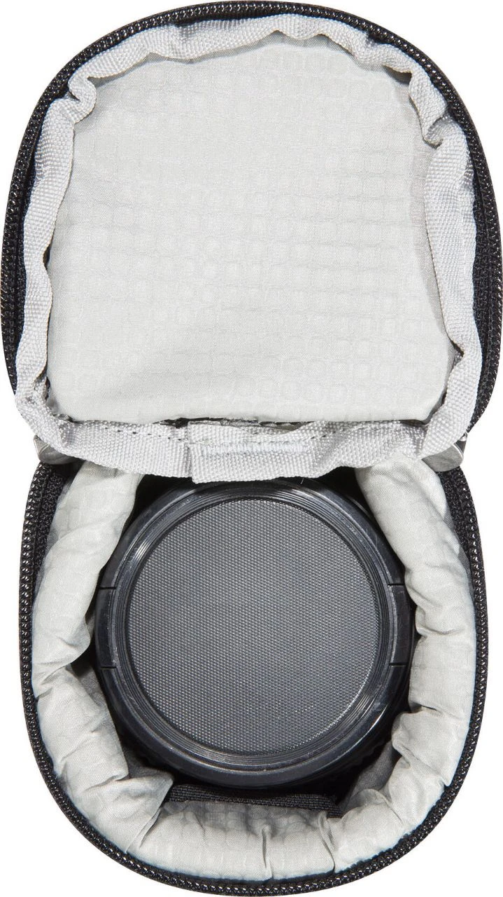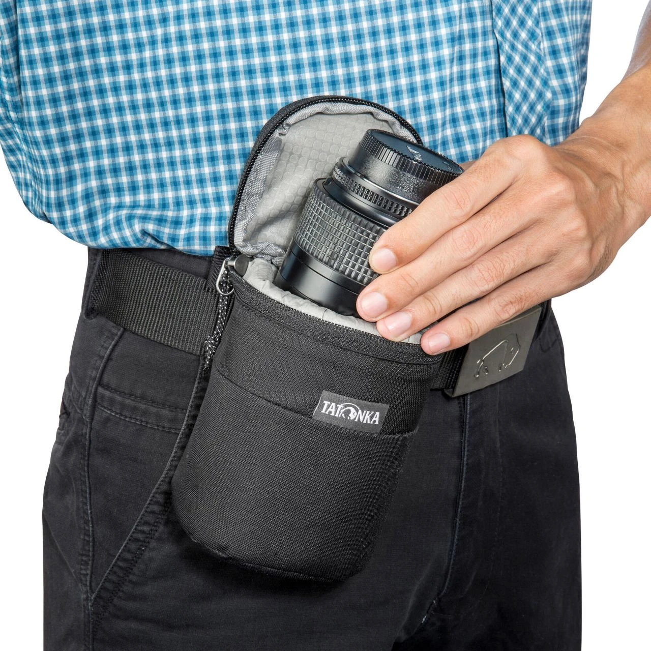 Padded camera lens bag Tatonka Lens Bag S with belt attachment The interchangeable lens is quickly at hand when it is stowed in the Tatonka Lens Bag S, because the padded lens bag can be attached to the belt by the loop on the back. The Lens Bag S has a zippered lid and is suitable for lenses up to 11 cm in length.